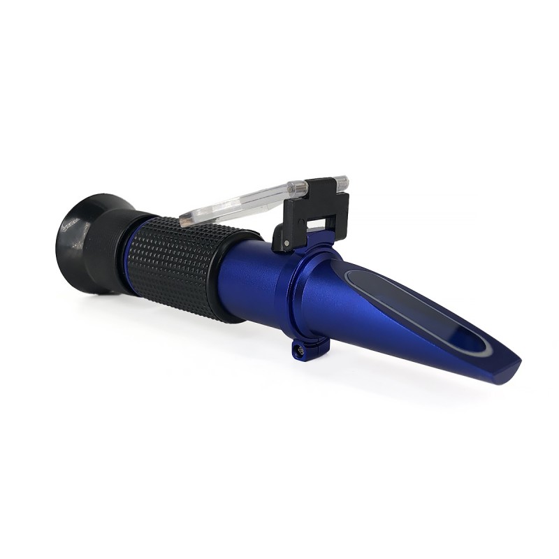 Открыть крышку, удалить воду и протереть призму и крышку мягкой тряпочкой > капнуть образец измеряемой жидкости на призму > закрыть и прижать стекло > нужное значение находится на границе голубой и белой полосы.