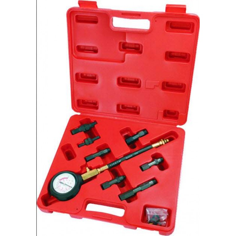 Набор для проверки движков с резьбой под свечу М10, М12, М14, М18:легок в применениив комплекте с адаптерами и резьбовыми переходникамиадаптеры стремительно инсталлируютсяинспектирует состояние ГБЦособый клапан позволяет устроить повторную проверку в отсутствии снятия манометраДиапазон измерений манометра: 0-20 бар/ 0-290 psiМанометр имеет две шкалы измерений.