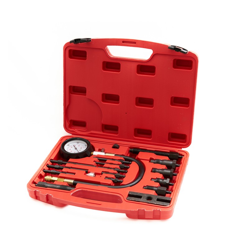 ST108 Компрессометр для дизельных ДВС с адаптерами, 0-1000PSI (0-70бар), 17 предметов используется во время сезонного техосмотра автомобиля или во время ремонта по причине возникновения неполадок в системе подачи топлива (поршень, цилиндр). Благодаря большому количеству адаптеров, входящих в комплект, проверку давления рабочей жидкости можно осуществлять в большинстве существующих автомобилей, оснащенных дизельным двигателем.