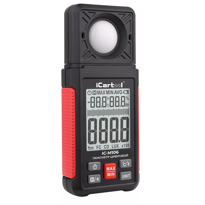 Цифровой люксметр iCartool IC-M106 измеряет уровень освещенности, создаваемой различными источниками света в определенной точке пространства. Прибор представляет собой моноблок со встроенным поворотным световым датчиком, большим хорошо читаемым дисплеем и удобной панелью управления. Недостаток света зачастую приводит к быстрой утомляемости глаз и значительному снижению трудоспособности, поэтому люксметр незаменим для проведения замеров уровня освещенности с целью создания оптимальных условий для жизни и работы.