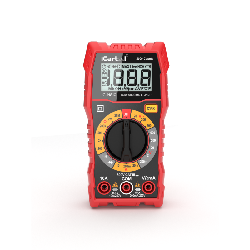 iCartool IC-M810L - бюджетный цифровой мультиметр с ручным выбором пределов измерений, классическим набором функций и возможностью измерения постоянного тока до 10 А. Предназначен для эффективной диагностики неисправностей электрооборудования в автомобилях и других областях с электрическими схемами, где есть напряжение от 200мВ до 600 В.