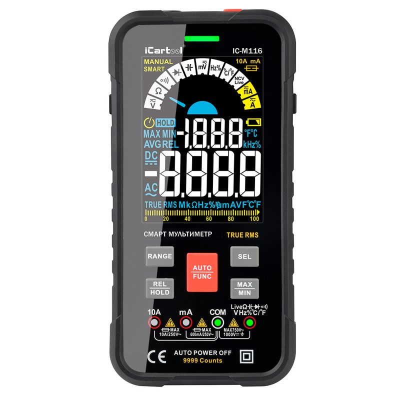 Интеллектуальный цифровой мультиметр IC-M116 с автоматическим выбором режима измерения, большим цветным дисплеем и широким набором дополнительных функций. Незаменим для решения задач по проверке, тестированию и диагностике электрооборудования. Имеет высокий рейтинг электробезопасности CAT III 1000V, CAT IV 600V и диапазон измерения силы тока до 10А. В комплект входят высококачественные мягкие и гибкие щупы, термопара и оригинальный защитный чехол.