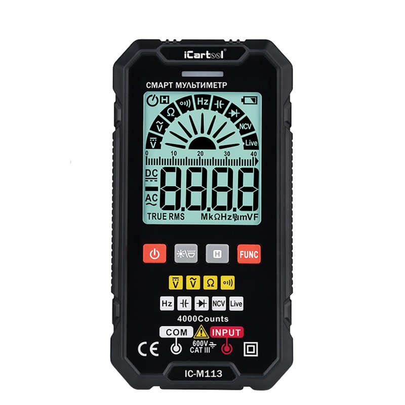 Цифровой смарт-мультиметр IC-M113 с технологией измерения значений True RMS, большим ЖК-дисплеем и классическим набором функций. Отличается малым весом и оригинальным современным дизайном. Подсветка экрана и яркий фонарик, встроенный в мультиметр помогут произвести замеры в условиях недостаточной освещенности. Незаменим для домашних ремонтных работ по электрике, в гараже для обслуживания электроцепей автомобиля и для радиолюбителей.