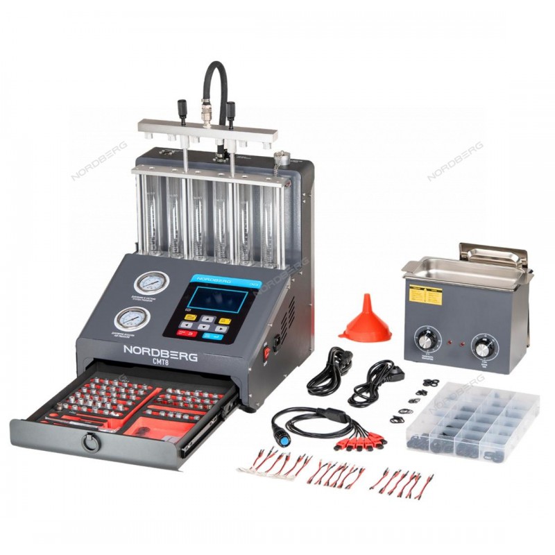 NORDBERG CMT8 – установка для тестирования и очистки форсунок GDI. Предназначена для автосервисов и технических центров.ФУНКЦИОНАЛNORDBERG CMT8 предназначена для диагностики, проверки и очистки бензиновых форсунок различных типов: GDI, FSI, SPI, MPI, SFI, PFI. ПРЕИМУЩЕСТВАТестирование под давлением до 0.8 МПа выявляет утечки и засоры в форсунках;Широкий диапазон частот работы 100–9900 об/мин и длительности импульсов 0.1–30 мс позволяет моделировать реальные условия работы двигателя;Емкость топливного бака 3,7 л, обеспечивает длительную работу.Ультразвуковая очистка в ванне 120 Вт эффективно удаляет отложения и нагар, восстанавливая работоспособность форсунок;Подключение к компрессору с давлением воздуха 4–8 бар повышает эффективность очистки, удаляя загрязнения из труднодоступных мест форсунки;Диапазон рабочих температур от +5 до +40°C позволяет использовать для различных климатических условий.УДОБСТВО ИСПОЛЬЗОВАНИЯОдновременная проверка до 6 форсунок;Русскоязычный интерфейс,правильное понимание функционала и предотвращение ошибок;LED-подсветка мерных колб улучшает визуальный контроль качества факела распыла форсунок;Выдвижной ящик для удобного хранения комплектующих и аксессуаров;Автоматический слив рабочей жидкости предотвращает перелив тестовой жидкости в колбы.КОМПЛЕКТАЦИЯУстановка для тестирования и очистки форсунок GDI – 1 набор;Ультразвуковой очиститель (включая крышку, кронштейн для чистки) – 1 набор ;Комплект топливораспределителя, включая адаптер 2 (D13.5) – 1 набор;Соединительный кабель импульсного сигнала 1 – 6 шт;Соединительный кабель импульсного сигнала 2 – 6 шт;Соединительный кабель импульсного сигнала 3 – 6 шт;Адаптер 1 для форсунки с верхней подачей топлива (D10.5) – 6 шт;Адаптер со швейцарской резьбой для форсунки с верхней подачей топлива (M10X1,0) – 6 шт;Адаптер с крупной резьбой для форсунки верхней подачи топлива (M12X1,75) – 6 шт;Заглушка (G1/4”) – 5 шт;Регулировочная стойка (H80) – 2 шт;Прижимной винт – 2 шт;Регулировочная стойка 2 (H160) – 2 шт;Адаптер для форсунки верхней подачи топлива (D10,8-11,8) – 6 шт;Адаптер для форсунки BENZ GDI (D16) – 6 шт;Адаптер для форсунки верхней подачи топлива (D17.5) – 6 шт;Адаптер для универсального инжектора GDI (M12X1,75) – 6 шт;Адаптер для форсунки верхней подачи топлива (D12.6) – 6 шт;Адаптер для форсунки верхней подачи топлива (D13.6) – 6 шт;Адаптер для форсунки верхней подачи топлива (D14.3) – 6 шт;Комплект уплотнительных колец – 1 комплект;Входной адаптер для воздуха – 1 шт;Тестовый адаптер – 1 шт;Воронка – 1 шт;Кейс – 1 шт;Силовой кабель – 2 шт.NORDBERG CMT8 – оборудование для диагностики и очистки форсунок, отличное решение для диагностики и восстановления форсунок.