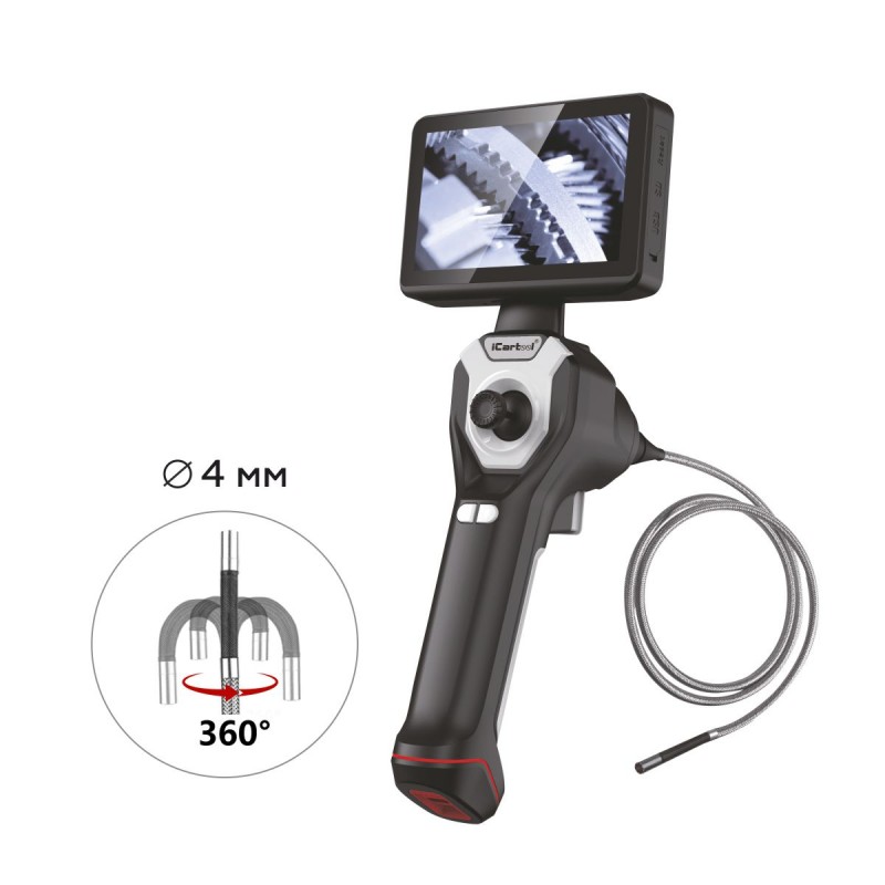 iCartool IC-VС104AW - промышленный видеоэндоскоп с дисплеем 4,5” и механизмом всесторонней артикуляции зонда на 360 градусов для панорамного обзора исследуемой области. Управление камерой происходит с помощью чувствительного джойстика, расположенного на рукоятке прибора. Предусмотрена фиксация (блокировка) головки зонда в заданном положении.