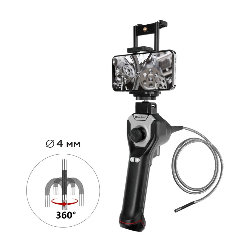 Камера с разрешением 1 Мп имеет автоматическую фокусировку в диапазоне от 1 см. Для работы в темных местах предусмотрена регулируемая LED подсветка с 3 уровнями яркости. Корпус эндоскопа легкий, удобно лежит в руке, оснащен собственным аккумулятором для продолжительной работы. Держатель смартфона съемный, имеет 2 варианта крепления к корпусу (вертикально и горизонтально) и надежно удерживает мобильное устройство (телефон/планшет) шириной до 18 см.