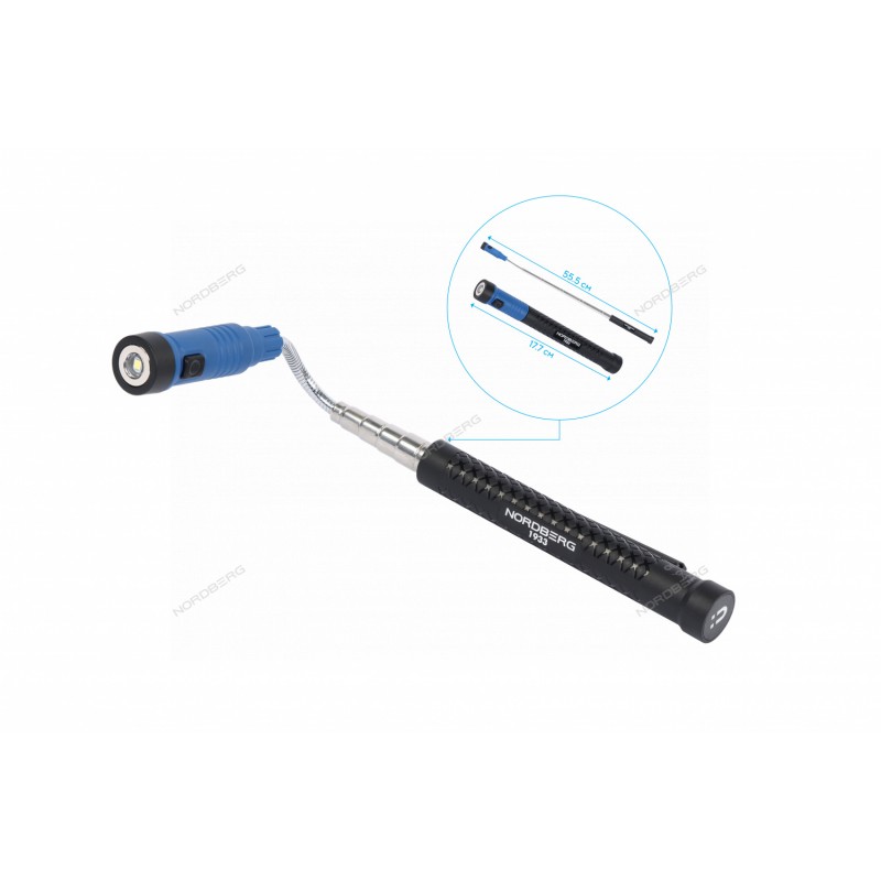 NORDBERG 1933 – светодиодный аккумуляторный телескопический фонарик с магнитным захватом.ФУНКЦИОНАЛОсвещение труднодоступных мест, таких как углублённые полости, отверстия, цилиндры, блоки, головки, картеры, ниши и установочные поверхности в моторном отсеке и других в местах, где из-за расположения деталей, проводов, тяг и т. д. затруднён доступ обычного фонаря.ПРЕИМУЩЕСТВАГибкая штанга фонаря регулируется в диапазоне от 17,7 до 50,5 см – удобная подсветка узких труднодоступных зон;Прорезиненная рукоятка позволяет удобно держать фонарь в руках;2 магнита сверху и снизу фонаря;Два режима освещения – низкая яркость 30 лм, высокая яркость 100 лм;Время работы от 2 до 6 часов в зависимости от выбранного режима;Пыленепроницаемость и влагостойкость по IP54 и IK08.Светодиодный гибкий аккумуляторный фонарь NORDBERG 1933 – удобный компактный инструмент при проведении ремонта, обслуживания или осмотра необходимых деталей и механизмов автомобиля в автосервисах и СТО.