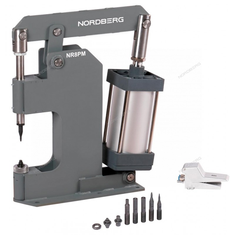 Пневматический станок NR8PM предназначен для установки и удаления заклепок на легковых, грузовых автомобилях и спецтехники. Используется при замене накладок тормозных колодок и дисков сцепления, цилиндр 160 мм позволяет работать с заклепками диаметром до 12 мм.ОСНОВНЫЕ ПРЕИМУЩЕСТВА:Большое усилие и высокая скорость работыМаксимальное усилие: 8 тоннМожет использоваться для стальных, алюминиевых и медных заклепокСтабильное центрированиеНадежная фиксация пуансонаУДОБСТВО ИСПОЛЬЗОВАНИЯ:Благодаря ножному управлению достигается простота и удобство в работе с тормозными колодкамиНизкий уровень шумаДля работы со станком требуется только подвод сжатого воздуха 6-10 бар.Специальная опора для регулирования положения колодки, обеспечивает удобство в работеУНИВЕРСАЛЬНОСТЬВ комплекте прилагается полный набор пуансонов NR10PK для работы с разными рабочими диаметрами заклепок - до 12 мм.ЦЕННОСТЬПокупка пневматического станка для заклепки грузовых тормозных колодок NR8PM - это инвестирование в надежный инструмент с многократной окупаемостью.ПРОЧНОСТЬ И НАДЕЖНОСТЬСтальной усиленный корпус, опорные штифты с закалкой, большая нижняя станина с 6-ю отверстиями для надежного крепления к верстакуКОМПЛЕКТАЦИЯКорпус с пневмоцилиндромПедаль ножного управленияСоединительные трубки.Набор пуансонов NR10PK для заклепок до 12 ммФитингиТумба для заклепочникаРуководство по эксплуатацииДля получения консультации от наших инженеров и технических специалистов по особенностям работы Пневматического станка для заклепки грузовых тормозных колодок NORDBERG NR8PM отправьте запрос на почту info@nordberg.ru