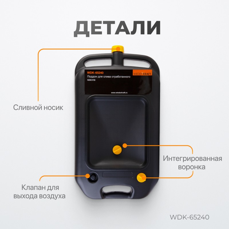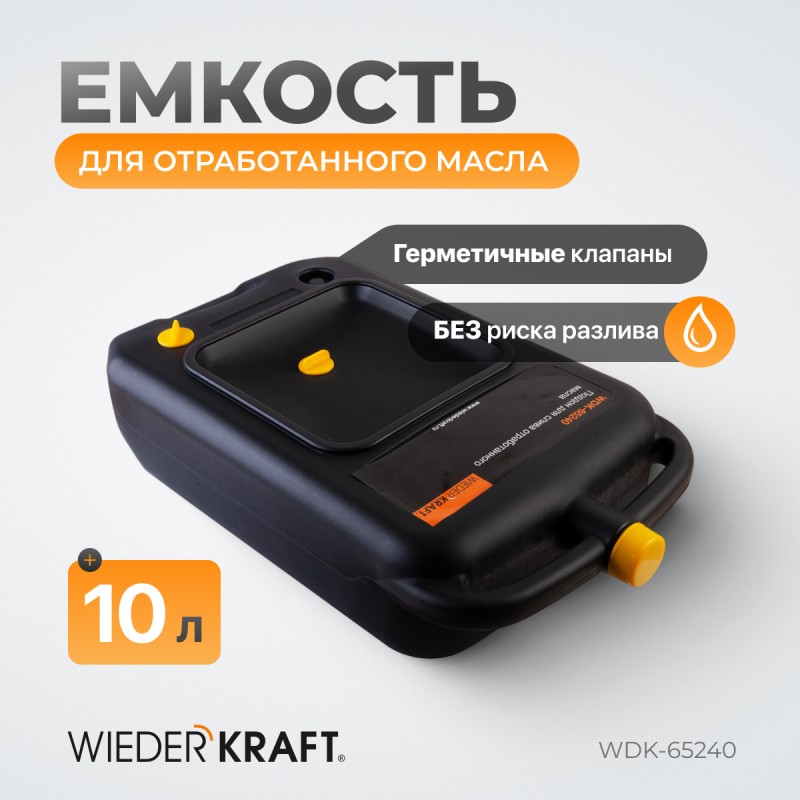 Емкость для слива и хранения отработанного масла WiederKraft 10 л WDK-65240 - пластиковая емкость изготовлена в виде поддона-канистры. Предназначена для сбора отработанного масла и прочих технических жидкостей, с последующим хранением.