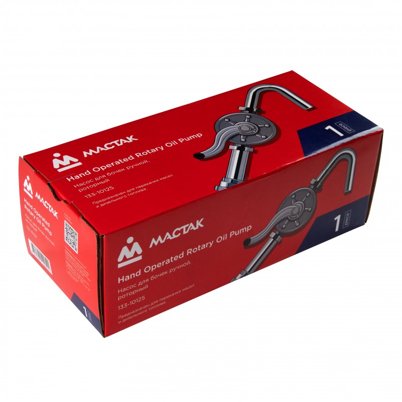 Упаковка – картонный короб в фирменном стиле бренда МАСТАК Размеры в упаковке – 355?155?130 мм Вес – 1,545 кг Комплектация – Корпус насоса роторного – Рукоять – Заборные трубки ? 32 мм, длина 330 мм – 3 шт. – Сливная трубка изогнутая