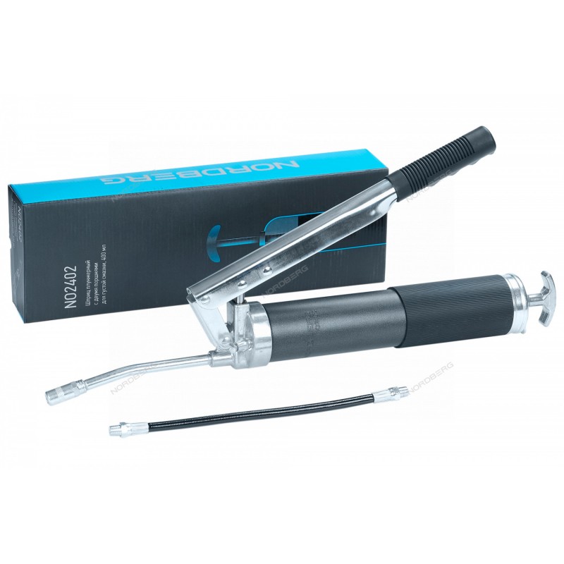 Шприц плунжерный с двумя поршнями для густой смазки, 400 мл NORDBERG N02402 2 рабочих поршня ускоряют процесс работыоснащен клапаном для стравливания воздухаМожет использоваться для катриджей со смазкойВ комплект входит: стальная трубка, гибкий шланг и 4-х лепестковая насадкаПредназначен исключительно для перекачки смазок вязкостью до NLGI 2. Шприц для смазки может быть заполнен тубой со смазкой по DIN 1284.Повышенное давление может привести к повреждению головки шприца и принадлежностей. Не прилагайте грубой силы при нажатии на рычаг, повышенное давление в точке смазывания может разрушить пресс-масленку, а также возможно подшипник или соответственно машину. Не применяйте удлинителей рычага и другие вспомогательные средства. Применяйте только оригинальные принадлежности.Для удаления из емкости для смазки всех воздушных пробок, необходимо поработать рычагом шприца. Шприц оснащен воздушным клапаном, нажмите на него. После стравливания воздуха, нажмите на рычаг несколько раз до тех пор, пока из штуцера не появится смазка.Производитель и продавец товара несут гарантийные обязательства в отношении оборудования, использование которого было осуществлено не превышая допустимые технические характеристики заявленные производителем в Паспорте-Инструкции. Гарантия не распространяется на шприцы, имеющие конструктивные изменения, механические или технические повреждения, вызванные использованием не по назначению или с нарушением правил и норм эксплуатации и хранения.
