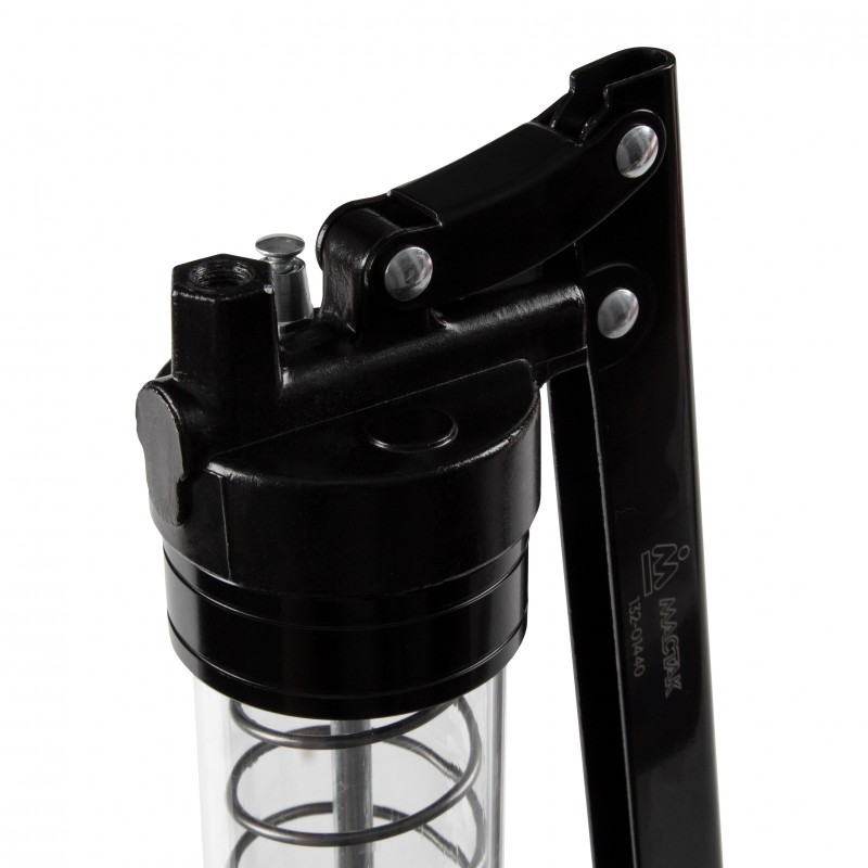 давление – 400 бар (5800 psi) Выпускной воздушный клапан – есть Материалы – алюминий (плунжерная головка), акрил (тубус), сталь (рукоять), ПВХ (защита рукояти), армированный нейлон (гибкий шланг) Упаковка – картонный короб в фирменном