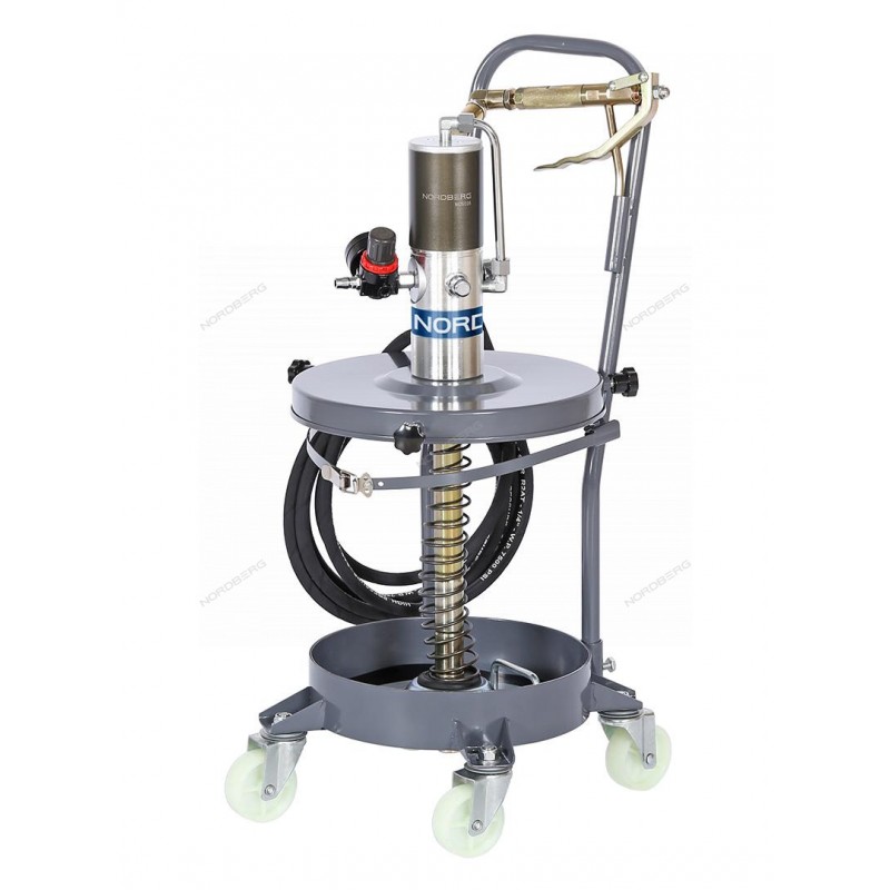 Пневматическая установка для раздачи густой смазки из бочекNORDBERG NO5016– специальное оборудование для обслуживания узлов и агрегатов в автосервисах, транспортных и других предприятиях, занимающихся обслуживанием и ремонтом транспортных средств и другого оборудования.ФУНКЦИОНАЛОсуществляет подачу пластичной смазки (солидол, литол и пр.) через пресс-масленку в машины, механизмы, корпуса редукторов и т.д.Работает от сжатого воздуха.ПРЕИМУЩЕСТВАЭффективная и безопасная работа благодаря пневматическому приводуПроизводительность 0,85 л/минПодача смазки из бочек 25 л и картонных барабанов 21 и 37 кгНе наносит вреда окружающей среде и не искритБыстрая подача смазки за счет высокого давленияУдобная передвижная конструкция с высокой рукоятью и 4 колесамиПродолжительный срок эксплуатацииУДОБСТВО ИСПОЛЬЗОВАНИЯНебольшая передвижная конструкция и гибкий выходной шланг длиной 4 метра позволяют оперативно произвести обработку различных узлов и агрегатов транспортных средств даже в труднодоступных местах.УНИВЕРСАЛЬНОСТЬУстановка может быть использована в различных отраслях, где требуется раздача густой смазки, таких как автосервисы, промышленные предприятия, в технике и механизмах на строительных площадках и т. д.Установка для раздачи густой смазки с тележкойNORDBERG NO5016– незаменимое сервисное оборудование для специалистов автосервисов и промышленных производств.