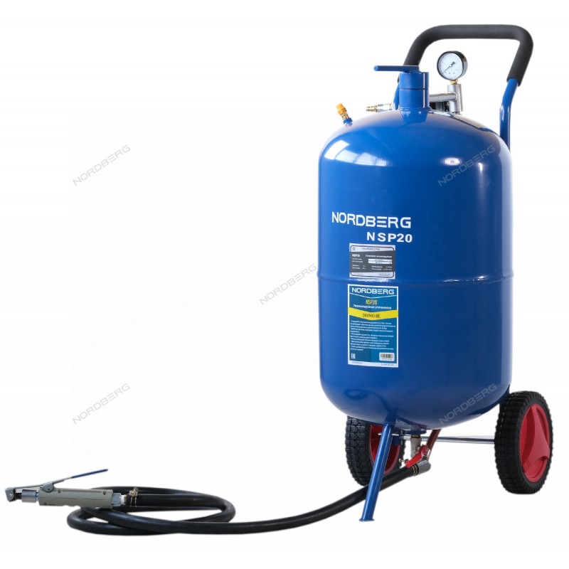 NORDBERG NSP20— профессиональная передвижная пескоструйная установка. Используется на СТО, в кузовных мастерских и производственных цехах.Для работы установки требуется внешний источник сжатого воздуха — компрессор.ФУНКЦИОНАЛПредназначена для удаления ржавчины, старой краски, окалины и загрязнений с металлических и других поверхностей воздушно-пескоструйным методом. Работает с различными абразивными материалами.ПРЕИМУЩЕСТВАОбъём резервуара — 74 л — обеспечивает длительную работу без дозагрузки абразива;Диапазон давления воздуха: 4–8,5 бар — позволяет гибко настраивать режим обработки;Поддерживаемый расход воздуха: 170–700 л/мин — адаптируется к возможностям компрессора;Длина абразивного шланга — 2,4 м — удобно для работы вокруг автомобиля;Комплект форсунок — оптимизирует эффективность обработки в зависимости от задачи;Манометр, регуляторы и влагоотделитель — для точного контроля и безопасной эксплуатации.УДОБСТВО ИСПОЛЬЗОВАНИЯМобильность — оснащена колёсами и ручками для перемещения по цеху;Воронка для загрузки абразива — ускоряет засыпку без потерь материала;Встроенный влагоотделитель — предотвращает попадание влаги в абразив;Маска в комплекте — обеспечивает защиту оператора во время работы.КОМПЛЕКТАЦИЯПескоструйная установка NSP20 — 1 шт;Пескоструйный пистолет с комплектом сменных сопел — 1 шт;Шланг подачи абразива — 1 шт;Воронка для загрузки абразива — 1 шт;Защитная маска — 1 шт;Инструкция по эксплуатации — 1 шт.NORDBERG NSP20— мощная и удобная пескоструйная установка для эффективной подготовки поверхностей к покраске и ремонту.Рекомендуем использовать в качестве абразива, порошок NORDBERG NS16CS