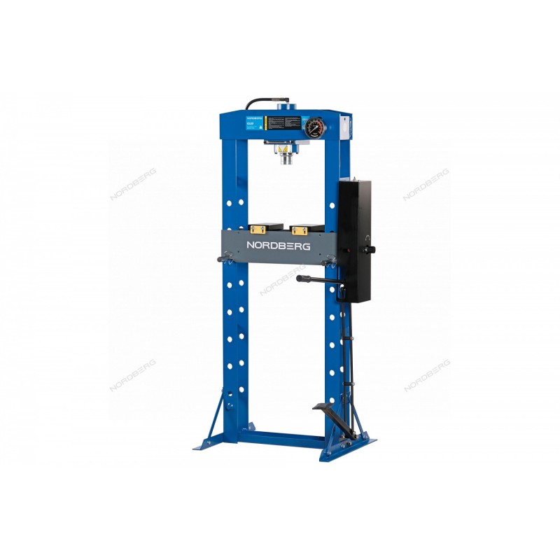 Гидравлический пресс с ручным и ножным приводом NORDBERG N3630F – оборудование для выполнения различных ремонтных работ в автосервисах и СТО.ФУНКЦИОНАЛИспользуется при следующих ремонтно-монтажных работах: выпрессовки подшипников и втулок, правки валов, осей, профилей, для прессования заготовок.ПРЕИМУЩЕСТВАМаксимальное усилие 30 тоннНадежная сварная рама обеспечивает устойчивость конструкцииВозможность смещения гидравлического цилиндраРегулируемый рабочий столГидравлический насос с ручным приводом.Ножная педальУДОБСТВО ИСПОЛЬЗОВАНИЯДве пластины трапеции для надежного упораМанометр для контроля рабочего давления расположен на уровне глаз.КОМПЛЕКТАЦИЯГидравлический пресс NORDBERG N3630FПластины трапецииПаспорт-инструкцияПресс гидравлический NORDBERG N3630F – незаменимое оборудование в автосервисах, гаражах, позволяющее эффективно и быстро выполнять различные ремонтные работы.