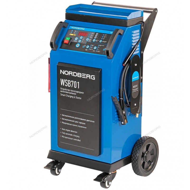 Пуско-зарядное интеллектуальное устройство NORDBERG WSB701 предназначено для обслуживания большого спектра автомобильных аккумуляторов различных транспортных средств в автосервисах и СТО.ФУНКЦИОНАЛОсуществляет зарядку АКБ и запуск двигателей автомобилей и грузовиков, имеющих емкость аккумулятора до 750 А٠Ч.ПРЕИМУЩЕСТВАИнтеллектуальное устройство: подходит для всех типов аккумуляторов WET/MF/CA/EFB/GEL/AGM, а также литиевых АКБ 12 ВНаличие режима "шоу-рум": устройство контролирует заряд АКБ и в случае падения напряжения ниже пороговых значений активирует процесс зарядки. Данный режим подойдет для автосалонов, когда требуется длительное включение освещения автомобиля.Высокая мощность 2500 Вт в режиме заряда и 20 000 Вт в режиме стартераМаксимальный ток в режиме запуска 750 АРежим быстрой зарядкиИнвертор нового поколения, позволяющий снизить потери тока в процессе зарядкиДля каждого типа АКБ предусмотрен выбор режима зарядкиУстройство имеет различные функции защиты: автоматическое отключение после окончания зарядки, от перегрева, от низкого входного напряжения, от короткого замыкания, от подключения в обратной полярностиКонструкция устройства позволяет свести к минимуму вероятность образования искры в результате эксплуатацииУДОБСТВО ИСПОЛЬЗОВАНИЯВозможность заряжать несколько АКБ 6 В, 12 В или 24 В одновременно.Устройство обладает функцией оповещения о различных неполадках в работе, что позволяет пользователю своевременно устранять их.Удобная мобильная конструкция благодаря широкой ручке и колесам.Специальный отсек на корпусе для хранения проводов.ЭТАПЫ ПРОЦЕССА ЗАРЯДКИДиагностика: на этом этапе устройство проверяет, подключена ли батарея к зарядному устройству.Десульфатация: проходит импульсная зарядка для удаления сульфата.Плавный старт: проверяется способность батареи воспринимать заряд, устройство производит зарядку с постепенным увеличением зарядного тока.Основной заряд: устройство производит зарядку максимальным током примерно до 80% емкости батареиДиагностика: осуществляется проверка батареи на предмет удержания заряда. Постоянная зарядка: проходит зарядка постоянно увеличивающимся напряжениемВосстановление: напряжение увеличивается с целью появления контролируемого газовыделения в батарее.Поглощение: батарея заряжается постоянным уменьшающимся током и максимальным напряжением.Диагностика: пзу проверяет, может ли батарея удерживать заряд.Техническое обслуживание: зарядное устройство контролирует напряжение батареи и периодически подаёт на неё небольшой заряд тока, тем самым поддерживая полный заряд батареи.КОМПЛЕКТАЦИЯПуско-зарядное устройство NORDBERG WSB701Кабель с клеммами для подключения к АКБКабель питанияПаспорт-инструкцияАвтомобильное ПЗУ NORDBERG WSB701 позволяет эффективно произвести зарядку АКБ и запуск транспортных средств.Подробную информацию об эксплуатации и характеристиках интеллектуального пуско-зарядного устройства NORDBERG WSB701 вы можете получить у наших инженеров и технических специалистов, отправив запрос по почте auto@master-instrument.ruПо вопросам дилерского сотрудничества пишите на почту info@nordberg.ru