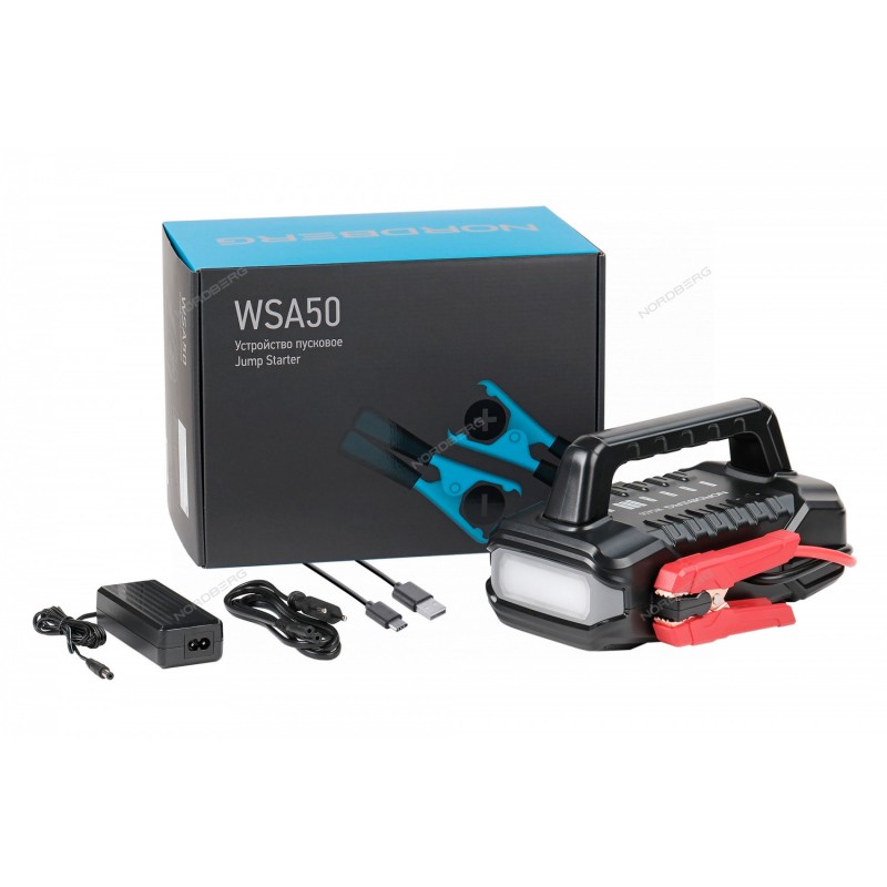 Пуско-зарядное портативное устройство NORDBERG WSA50 – компактная и мощная модель с большой емкостью встроенного аккумулятора для запуска бензиновых и дизельных двигателей.ФУНКЦИОНАЛУстройство предназначено для быстрого запуска двигателей транспортных средств с аккумуляторными батареями 12 В и 24 В в условиях, когда аккумулятор транспортного средства разряжен. Бустер также используется для зарядки телефонов, планшетов, видеокамер и других устройств, напряжение ЗУ которых составляет 5 В, 9 В.ПРЕИМУЩЕСТВАМаксимальный пусковой ток 1000 А, пиковый ток 2000 АРежим автоматического подогрева литиевой батареи при температуре ниже -20 °СВстроенный мощный светодиодный фонарь-прожектор с обычным и сигнальным режимами работыУДОБСТВО ИСПОЛЬЗОВАНИЯОтображение индикации заряда на корпусеНебольшой вес и габаритыУНИВЕРСАЛЬНОСТЬПусковое устройство может применяться как для легкового, так и для грузового транспорта.Возможность зарядки любых мобильных устройств через USB-порт.КОМПЛЕКТАЦИЯПусковое устройство NORDBERG WSA50Зарядное устройство с сетевым проводомКомплект зажимовПаспорт-инструкцияБустер NORDBERG WSA50 – универсальное устройство, позволяющее в кратчайшие сроки запустить различные двигатели или зарядить мобильные устройства.