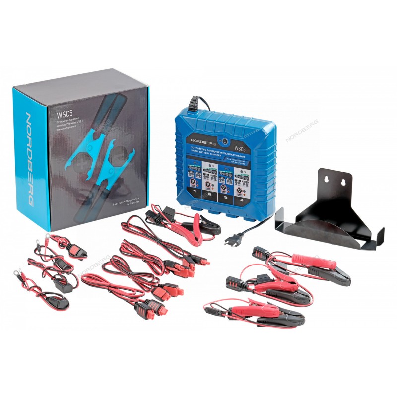 NORDBERG WSC5— интеллектуальное зарядное устройство для профессионального использования на СТО и в сервисных центрах.ФУНКЦИОНАЛПредназначен для зарядки 6В и 12В свинцово-кислотных аккумуляторов всех типов — WET, MF, EFB, GEL, AGM — а также 12В литиево-ионных аккумуляторов. Заряжает на 100% до 4 аккумуляторов одновременно. Обеспечивает безопасную, быструю и полную зарядку с автоматическим контролем параметров на каждом канале.ПРЕИМУЩЕСТВАВыходной ток 4×1,5 А — стабильная зарядка без перегрева;Ёмкость поддерживаемых АКБ: от 2 до 60 А·ч — охватывает широкий спектр применений;Автоматический переход в режим хранения — предотвращает перезаряд и продлевает срок службы батареи;Полная защита: от перегрева, короткого замыкания, обратной полярности и искрения;Память последней сессии — продолжает работу с прежними настройками;Степень защиты IP65 — допускает эксплуатацию во влажных и запылённых условиях.УДОБСТВО ИСПОЛЬЗОВАНИЯПростое управление режимами через панель с LED-индикацией;Поддержка 5 режимов работы — включая зарядку при низких температурах и для литиевых АКБ;Универсальные зажимы и коннекторы — подходят для различных типов клемм;Индикация уровня заряда — от 25% до 100% по светодиодной шкале;Возможность настенного монтажа — экономит место в рабочей зоне.КОМПЛЕКТАЦИЯЗарядное устройство WSC5 — 1 шт;Кабель питания — 1 шт;Провод для подключения к АКБ — 4 шт;Зажимные коннекторы — 4 шт;Кольцевые коннекторы — 4 шт;Переходники для подключения к АКБ — 4 шт;Кронштейн для настенного крепления — 1 шт;Установочные болты — 4 шт;Предохранители — 4 шт;Инструкция — 1 шт.NORDBERG WSC5— надёжное и современное решение для быстрой и безопасной зарядки аккумуляторов в условиях автосервиса.