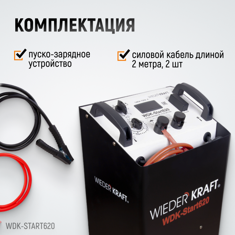 Пуско-зарядное устройство (трансформаторное, для аккумуляторов до 1000Ач) WiederKraft WDK-Start620 представляет собой простой в обслуживании и управлении аппарат для работы с аккумуляторами транспортных средств вплоть до грузовиков. Контроль заряда осуществляется при помощи встроенного амперметра. Благодаря удобному расположению элементов управления и наличию проводов в комплекте устройство можно свободно эксплуатировать сразу же после приобретения. ПЗУ подключается к обычной домашней сети.