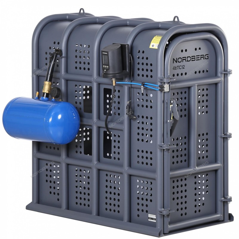 NORDBERG 46TC12 — клеть для накачки грузовых колёс.ФУНКЦИОНАЛПредназначена для безопасной накачки шин грузовых автомобилей, автобусов, сельскохозяйственной и строительной техники. Основное назначение — защита оператора от травм при возможном взрыве шины в процессе накачивания.ПРЕИМУЩЕСТВАПрочная конструкция — каркас выполнен из цельногнутых труб и металлических листов, что формирует замкнутую коробчатую структуру, повышающую жёсткость конструкции и обеспечивающую безопасность оператора;Надёжный механизм запирания двери — с одной стороны дверь закреплена на трёх цельносварных петлях, обеспечивающих прочную и долговечную фиксацию. С противоположной стороны расположены тройная система задвижек, который надёжно удерживает дверь в закрытом положении;Пневмоклапан подачи воздуха — автоматически отключает подачу воздуха при незапертой двери;Автоматическая система накачки шин — позволяет локально или дистанционно задать точное давление и контролировать процесс через дисплей или приложение на смартфоне, исключая риск перекачки;Устройство для взрывной накачки (бустер) — переносной, крепится сбоку на кронштейнах, легко снимается и может использоваться отдельно. Обеспечивает быструю посадку бескамерной шины на обод;Пульт дистанционного управления или приложение на смартфоне — позволяет оператору управлять процессом из безопасной зоны;Технологические отверстия в стенках усиленной конструкции — позволяют подключать оборудование и выполнять работы с колесом без открытия клетки;Петли для транспортировки — обеспечивают удобное и безопасное перемещение конструкции.NORDBERG 46TC12 — надёжное и безопасное решение для работы с грузовыми колёсами. Усиленная конструкция, автоматизация процесса и многоуровневая защита оператора делают эту клеть оптимальным выбором для профессионального использования в условиях повышенного риска.