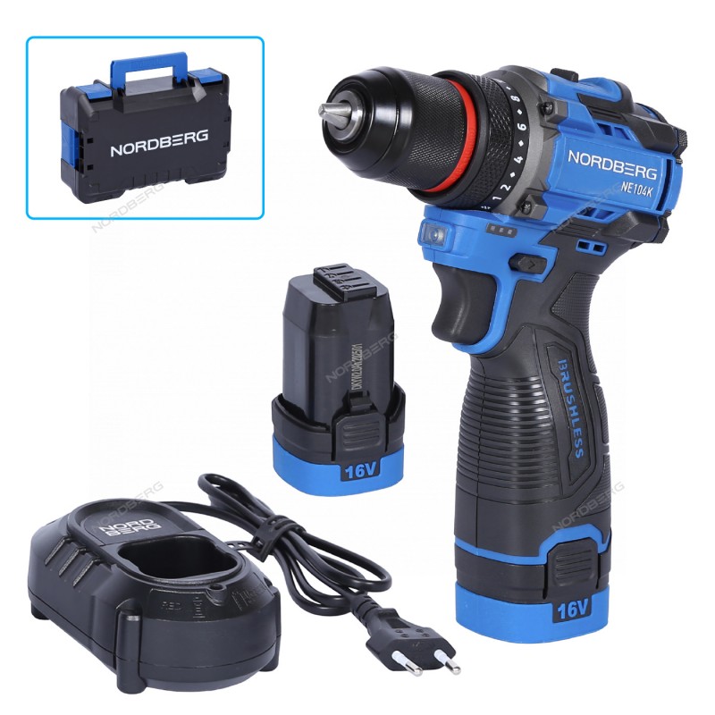 NORDBERG NE104K — аккумуляторный шуруповерт с высоким крутящим моментом. Используется в мастерских, строительных и ремонтных работах.ФУНКЦИОНАЛПредназначен для заворачивания и отворачивания винтов, шурупов, а также сверления отверстий в дереве, металле, пластике и керамике.ПРЕИМУЩЕСТВАКрутящий момент – 60 Нм, что позволяет заворачивать шурупы и другой крепеж в материал высокой плотности;Частота вращения – 0–500 об/мин (I)/0–2000 об/мин (II), регулируемая для точного подбора скорости;Бесщёточный мотор – увеличенный ресурс работы и снижение нагрева;Два аккумулятора 16 В, 2 А·ч – длительная работа без подзарядки;Время работы от одной зарядки – до 45 минут без нагрузки;Быстрая зарядка – зарядное устройство с выходом 16 В / 1,3 А;Максимальный диаметр сверления – 10 мм, универсален для большинства задач;Реверс и регулировка крутящего момента – точная настройка под разные материалы.УДОБСТВО ИСПОЛЬЗОВАНИЯЭргономичный дизайн – снижает усталость при длительной работе;Компактный и легкий – удобный корпус с прорезиненной рукояткой для комфортного хвата;Быстрозажимной патрон – быстрая смена насадок без дополнительных инструментов;Система защиты – от перегрузки, перегрева и глубокого разряда аккумулятора;Интуитивное управление – удобный переключатель режимов скорости;LED-подсветка – удобство работы в условиях недостаточного освещения.КОМПЛЕКТАЦИЯШуруповерт – 1 шт;Аккумулятор 16 В, 2 А·ч – 2 шт;Зарядное устройство 220 В / 16 В, 1,3 А – 1 шт;Инструкция по эксплуатации – 1 шт.NORDBERG NE104K — надежный, мощный и удобный шуруповерт для профессионального и бытового использования.