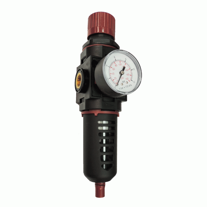 Фильтр-регулятор или как иногда ещё его называют фильтр-редуктор объединяет в себе функции фильтра и регулятора. Фильтр очищает воздух от механических примесей и излишней влаги, регулятор давления позволяет регулировать давление и сглаживать его колебания. Это позволяет занимать меньше места, чем два устройства по отдельности. Фильтр-регуляторы обычно применяют в сочетании с пневмооборудованием или пневмоинструментом, которое не требует смазки (краскораспылители, пневмоцилиндры, пескоструйные аппараты и др.), поэтому маслораспыляющий блок (маслораспылитель, лубрикатор) оказывается ненужным. Рассчитаны фильтр-регуляторы на давление не более 16 бар, рабочее давление от 0,5 до 10 бар.