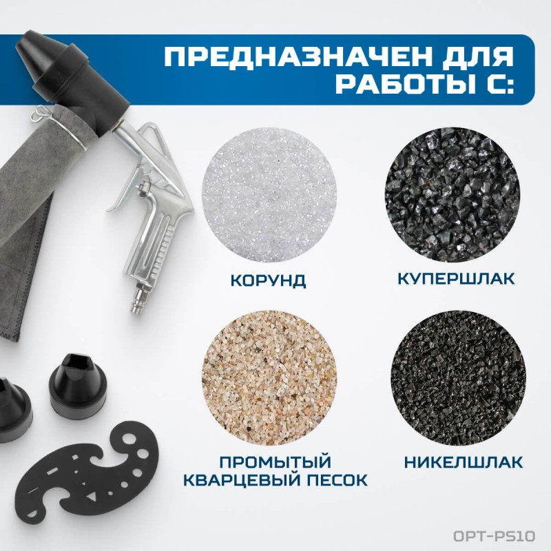 Пескоструйный пистолет OPTIMUS OPT-PS10 служит для удаления признаков коррозии, старых лакокрасочных покрытий и прочих загрязнений с кузова. Используется с такими абразивными материалами, как купершлак и никельшлак, корунд, кварцевый песок.