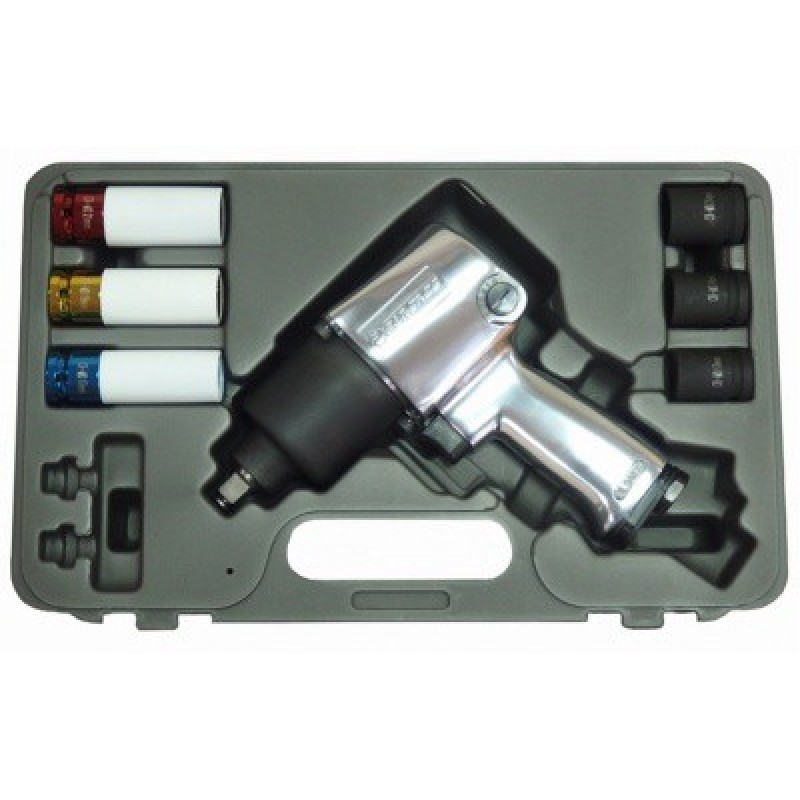 1/2" Пневмогайковерт 813Нм с комплектом головок 7предметов (17,19,21мм+17,19,21мм для литых дисков)Макс. момент затяжки 813 НмРасход воздуха 120 л/минРабочее давление 6.3 барРазмер (квадрат) хвостовика 1/2"