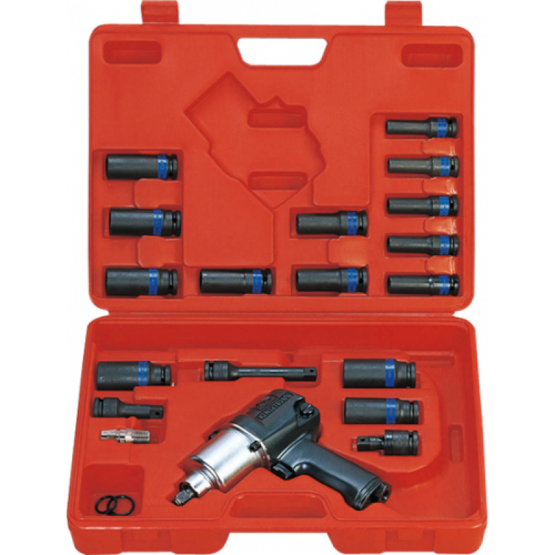 Гайковерт оснащен регулятором мощности.В комплект входит: Головка ударная глубокая 1/2" 10 мм 443510М Головка ударная глубокая 1/2" 11 мм 443511М Головка ударная глубокая 1/2" 12 мм 443512М Головка ударная глубокая 1/2" 13 мм 443513М Головка ударная глубокая 1/2" 14 мм 443514М Головка ударная глубокая 1/2" 16 мм 443516М Головка ударная глубокая 1/2" 17 мм 443517М Головка ударная глубокая 1/2" 19 мм 443519М Головка ударная глубокая 1/2" 21 мм 443521М Головка ударная глубокая 1/2" 22 мм 443522М Головка ударная глубокая 1/2" 23 мм 443523М Головка ударная глубокая 1/2" 24 мм 443524М Головка ударная глубокая 1/2" 26 мм 443526М Головка ударная глубокая 1/2" 27 мм 443527М Гайковерт пневматический 1/2" 678 Нм, 7000 об/мин 33411-040 Кардан ударный 67 мм с шариковым фиксатором Удлинитель ударный 1/2" 75 мм Удлинитель ударный 1/2" 125 мм
