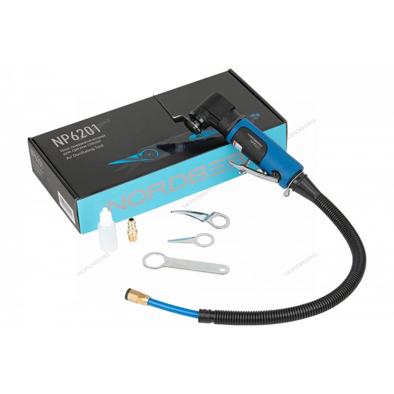 Пневматический нож NORDBERG NP6201 – профессиональный режущий инструмент для технических работ в автосервисах и СТО.ФУНКЦИОНАЛСрезание герметика при демонтаже автомобильных стекол одним специалистом. Благодаря лезвию, совершающему возвратно-поступательные движения, происходит прорезание герметизирующего слоя, при помощи которого стекло приклеено к кузову автомобиля.ПРЕИМУЩЕСТВАВысокая скорость 5000 об/мин делает возможным и безопасным процесс срезания стекла одним человеком, в отличие от струны и других ножейРукоятка с эластичным покрытиемСменные лезвия различной длины, а также ключ в комплектеПредохранитель на стартовой клавишеУДОБСТВО ИСПОЛЬЗОВАНИЯПневматический нож значительно упрощает процесс удаления автомобильных стекол, предоставляет высокую маневренность и точность при работе, обеспечивая быстрое и гладкое срезание стекол.Комплект инструмента NP6201 включает в себя:нож пневматический для срезки стекол со шлангом – 1 шт.нож-насадка – 3 шт.гаечный ключ – 1 шт.адаптер – 1 шт.емкость для масла (пустая) – 1 шт.паспорт-инструкция – 1 шт.Пневмонож NORDBERG NP6201 сделает процесс удаления стекол безопасным и эффективным, повышая производительность автосервиса.