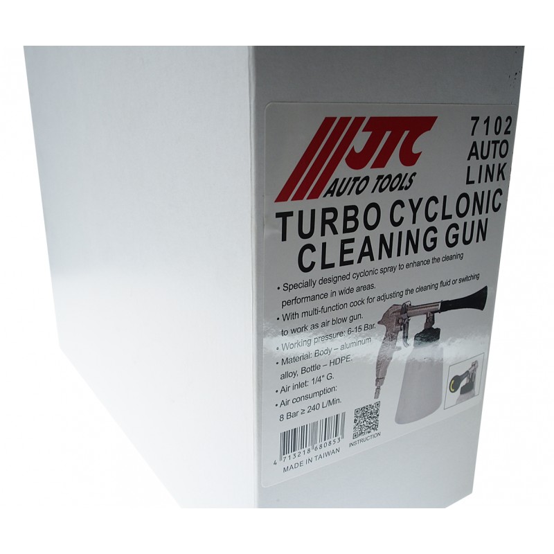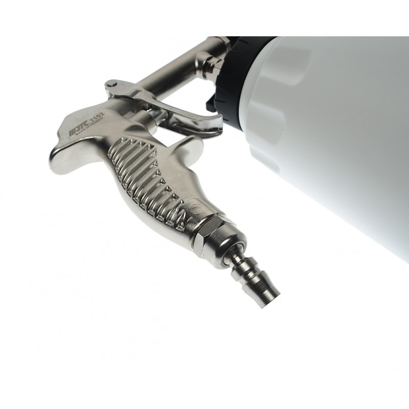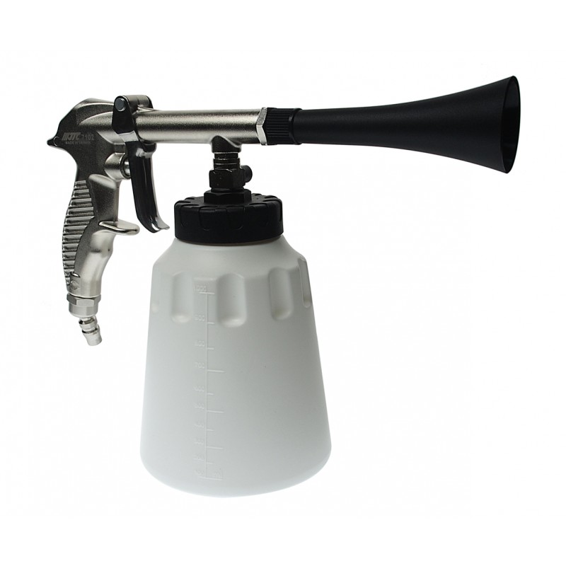 Применяется для очистки автомобильных сидений, обшивки, внутренних элементов салона и подкапотного пространства. Соединительный штуцер: 1/4 PT. Рабочее давление: 6-15 бар. Рукоятка из алюминиевого сплава, емкость — HDPE. Расход воздуха: 8 бар ≥240 л/мин.