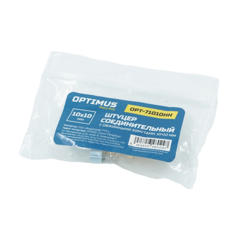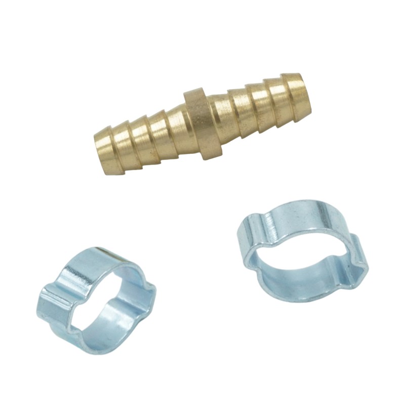 Штуцер соединительный латунный елочка-елочка 10 ? 10 мм, 2 обжимных оцинкованных стальных хомута OPT-71010HH
