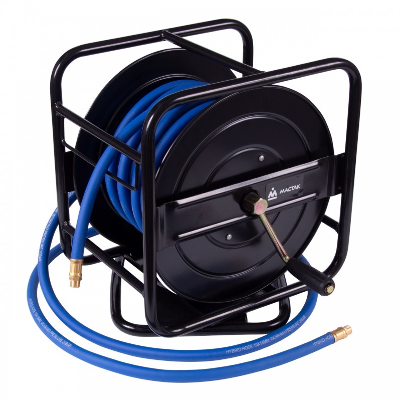 Особенности Шланг размещён на катушке открытого типа. Корпус катушки представляет собой металлическую раму, расположенную на поворотном основании, которое позволяет повернуть катушку в нужном направлении без необходимости перестановки