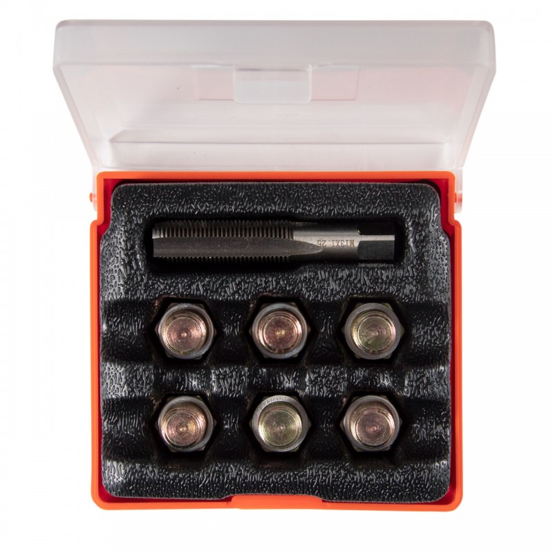 Назначение Восстановление поврежденной или сорванной резьбы маслосливных отверстий. Комплектация – Метчик M13?1.25 – Маслосливные пробки 6 шт. – Шайбы алюминиевые 12 шт. – Пластиковый бокс Рекомендованный ? сверла – 11,8 мм (в комплект