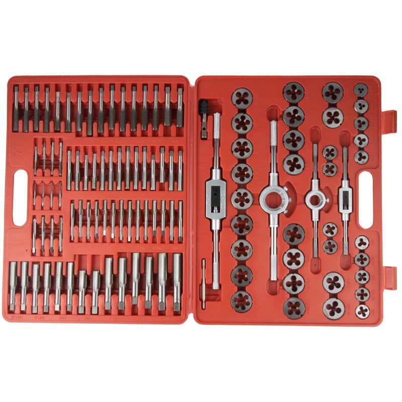 В комплекте имеется выбор метчиков и плашек, которые подходят для резьбы M2-М18.