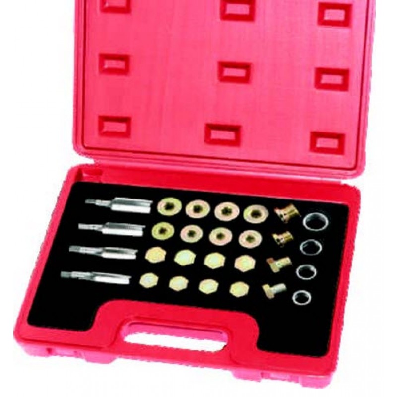Набор для легкого и быстрого восстановит поврежденную резьбу в отверстии для поддона масла. Использование: использовать смазку при нарезании резьбы, стружку удалять с помощью воздуха. (2)Шайбы. 4 шт. Метчик. 20 шт. Хром-ванадивые пробки. M13, M15, M17, M20. Обновление резьбы и переустановки пробки слива масла. 4 самых распространенных размера. Спецификация: M13x1.5P, M15x1.5P, M17x1.5P, M20x1.5P.