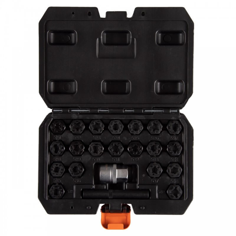 Назначение Монтаж и демонтаж секреток колесных дисков автомобилей группы VAG. Комплектация – Головка торцевая 19 мм 1/2 шестигранная, размер под ключ 21 мм – Насадки (размерный номер) #521, #522, #523, #524, #525, #526, #527, #528, #529,