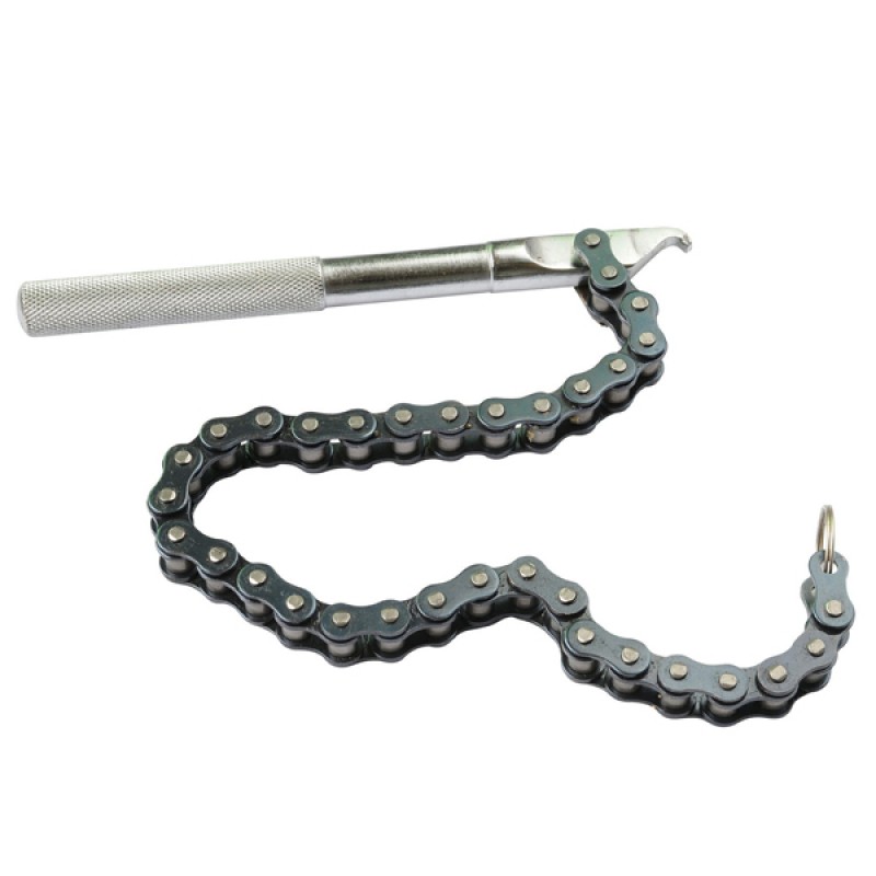 ST070 Фильтросъемник цепной, 458 мм служит для демонтажа масляных фильтров во время проведения авторемонтных работ. Рукоятка из прочной стали выполняет роль рычага. На конце расположена цепь, которая надежно обхватывает фильтр для его скручивания.