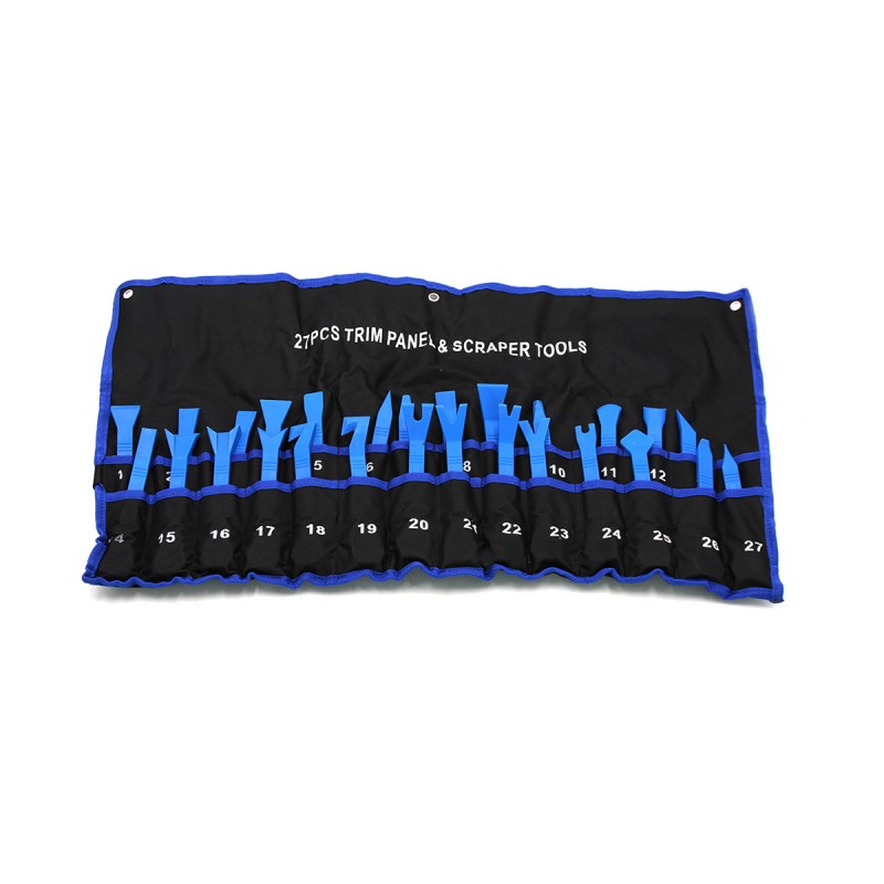 Набор лопаток для демонтажа заклепок и различных элементов с внутренней обшивки автомобиля 27 пр позволяет безопасно извлечь все элементы крепления и внутренней обшивки автомобиля. Комплект из 27 предметов значительно сократит время при проведении подобных работ. Все лопатки изготовлены из мягкого материала, что предотвращает появление царапин и сколов на деревянной, пластиковой или металлической поверхности деталей обшивки.