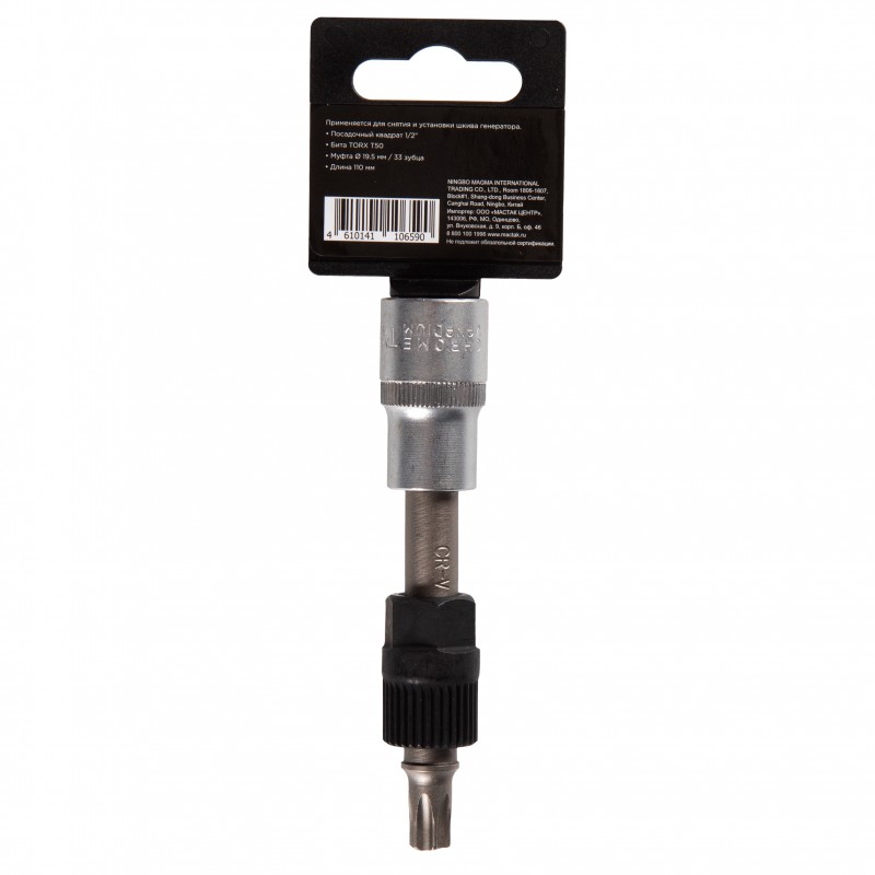 Применяется для снятия и установки шкива генератора. • Посадочный квадрат 1/2 • Бита TORX T50 • Муфта ? 19.5 мм / 33 зубца • Длина 110 мм