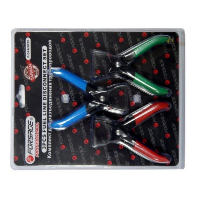 Комплект щипцов для разъединения трубопроводов,3 предмета на блистереКлещи для открывания соединительных муфт топливопроводаПрименение:Подходит для CHRYSLER, CHEVROLET, CITROEN, FIAT, FORD, OPEL, PEUGEOT, PONTIAC, RENAULT, VW и пр. ОписаниеУ топливопроводов, соединенных штекерными соединениями, используются клещи для разъединения муфт диаметром 8мм и клещи для муфт диаметром10мм(Разъединительные сегменты доступны с торцевой стороны)Соединительные муфты топливопровода у OPEL GM FIAT и пр., у которых разъединительные сегменты доступны с боку, необходимы клещи с двумя головками 6,5х6мм.