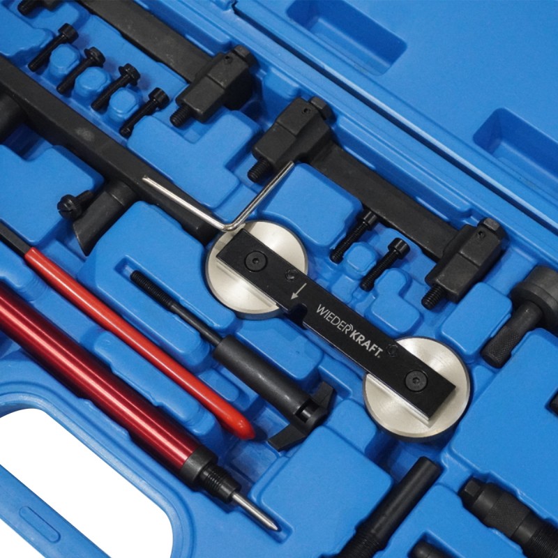 Набор WDK-2142VG для установки фаз ГРМ на автомобилях VW, AUDI, SKODA, SEAT. Универсальный набор инструмента состоит из 13 приспособлений и применяется для проведения ремонтных работ ГРМ бензиновых и дизельных двигателей VAG 1.2L/1.4L/1.6L/2.0L/2.4L/2.5L/3.2L/4.2L/5.2L MPI,FSI,TFSI,TSI. Может быть использован при ремонте двигателей серии EA111, EA113 и их производных. Частично подходит для двигателей EA888.