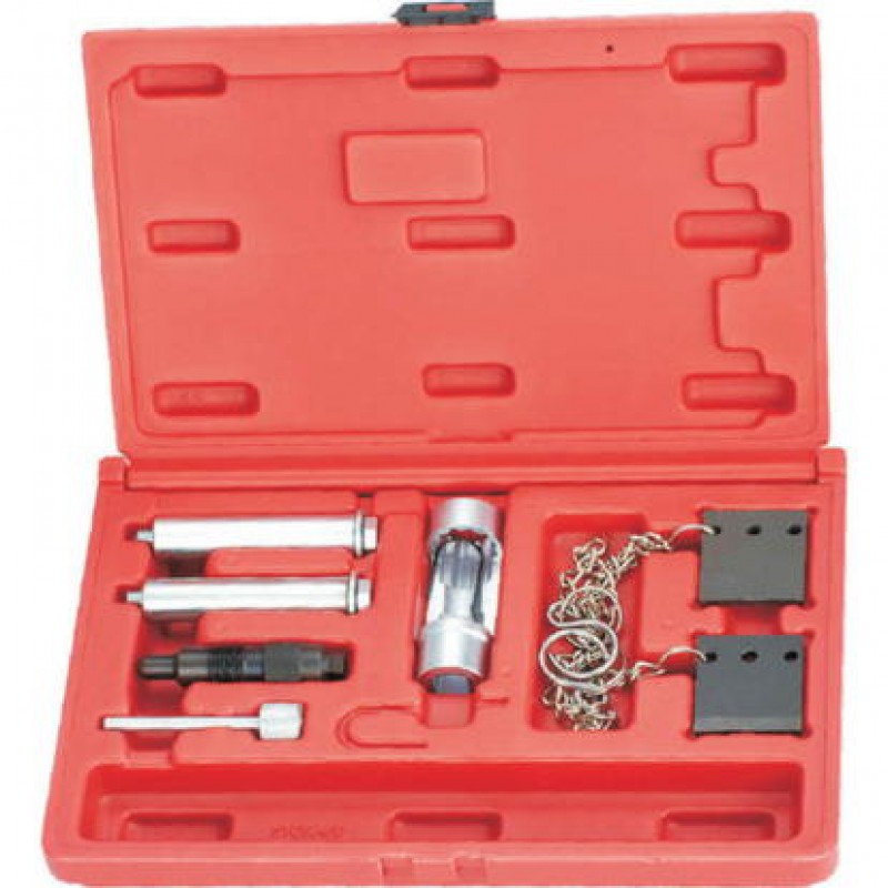 Набор фиксаторов для установки меток ГРМ на дизельных двигателях VAG-группВ наборе:2 - Фиксирующие планки для распределительных валовOEM-номер: 34581 - Фиксатор коленчатого валаOEM-номер: 32421 - Головка для натяжителя ремняOEM-номер: 30781 - Фиксатор гидравлического натяжителяOEM-номер: T400111 - Фиксатор ролика натяжителяOEM-номер: T100602 - Направляющие для установки передней части автомобиля в сервисное положениеOEM-номер: 3369
