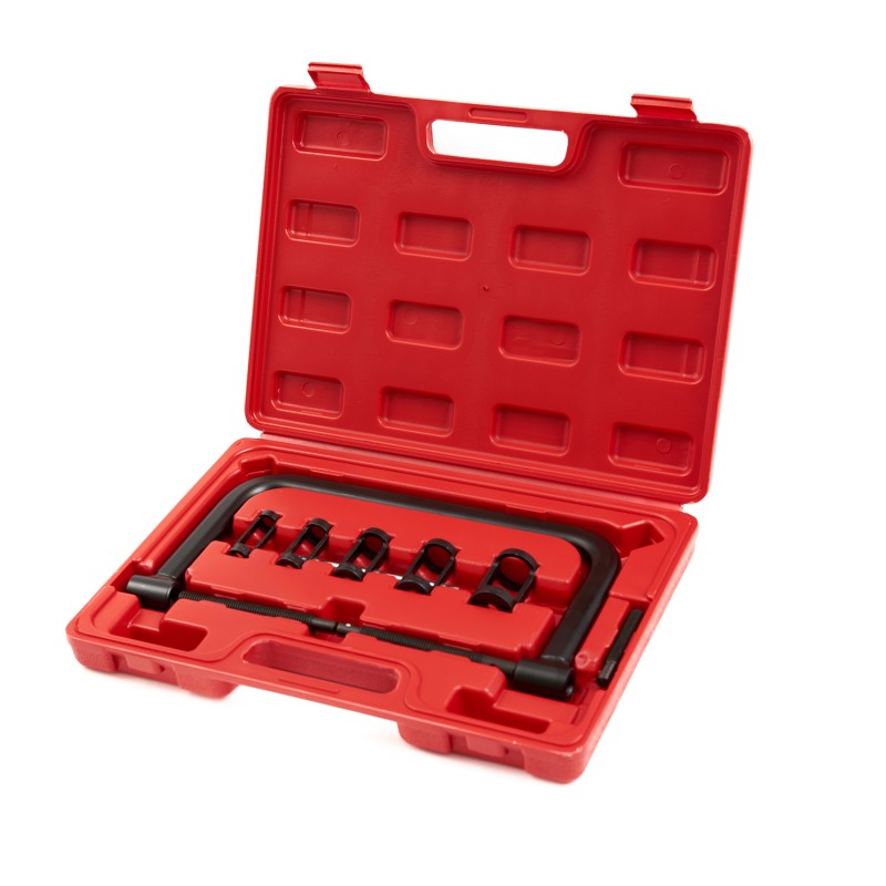 ST091 Рассухариватель клапанов. Размер толкателей 16, 19, 23, 25, 30 мм используется при замене клапанов или во время других операции, связанных с извлечением клапанов из головки блока цилиндров. Применяется для автомобилей и мотоциклов. Толкатели предназначены для легкого сжатия клапанной пружины и ее корректной фиксации. Набор упакован в прочный переносной пластиковый кейс.