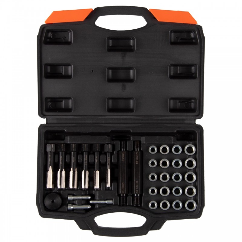 Назначение Ремонт и восстановление резьбы свечей накаливания. Комплектация – Метчики свечные/футорочные M8?1.0, M10?1.0, M10?1.25, M12?1.0, M12?1.25, M14?1.25 – Футорки M8?1.0, M10?1.0, M10?1.25, M12?1.25 по 5 шт. – Инструмент для установки