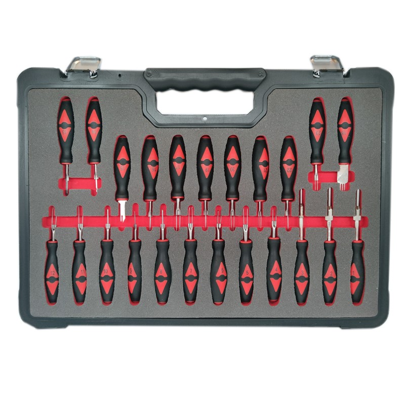 Набор для разъединения электроконтактов, 23 предмета, предназначен для бережного демонтажа контактов (плоских, круглых и др.) из разъёмов. Экстракторы, входящие в комплект набора, служат для разблокировки замков контактов в электрических разъёмах. Набор позволяет проводить работы практически со всеми разъёмами, используемыми на легковых, грузовых автомобилях и автобусах. Может применяться в автосервисе в качестве профессионального гаражного инструмента.