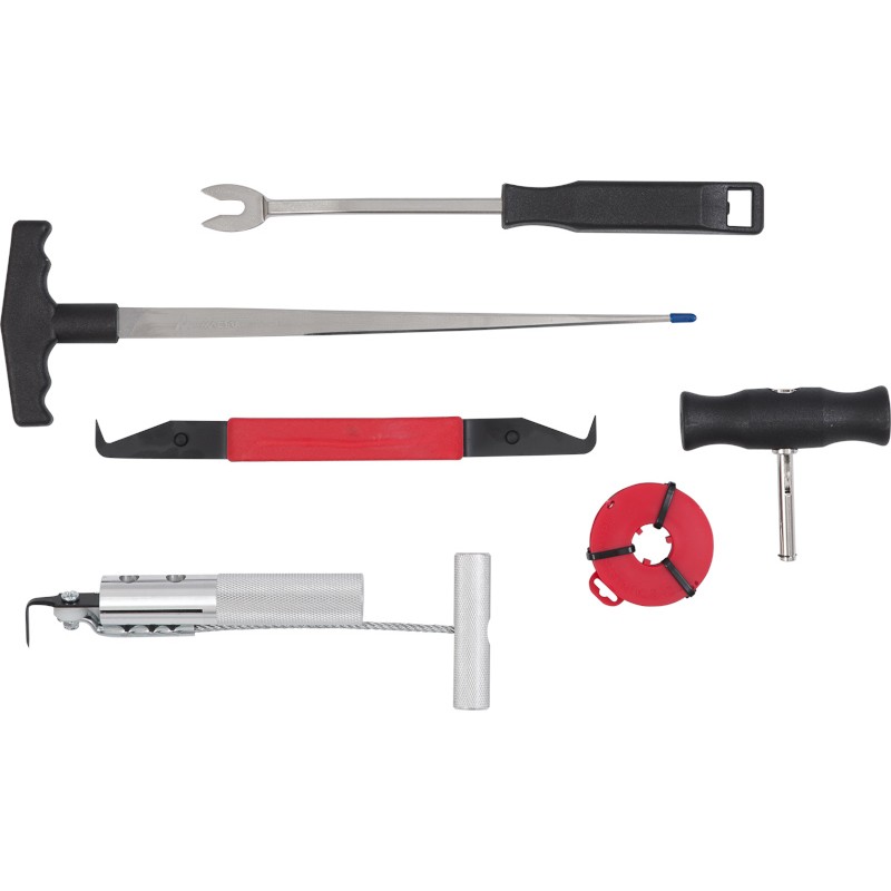 Набор для демонтажа стекол, 7 предметов МАСТАК 107-03006 предназначен для демонтажа стеклянных конструкций вклееных в корпуса, металлоконструкции и т.п.. Отлично подойдет для автослесарной мастерской, станции ТО или на производстве.