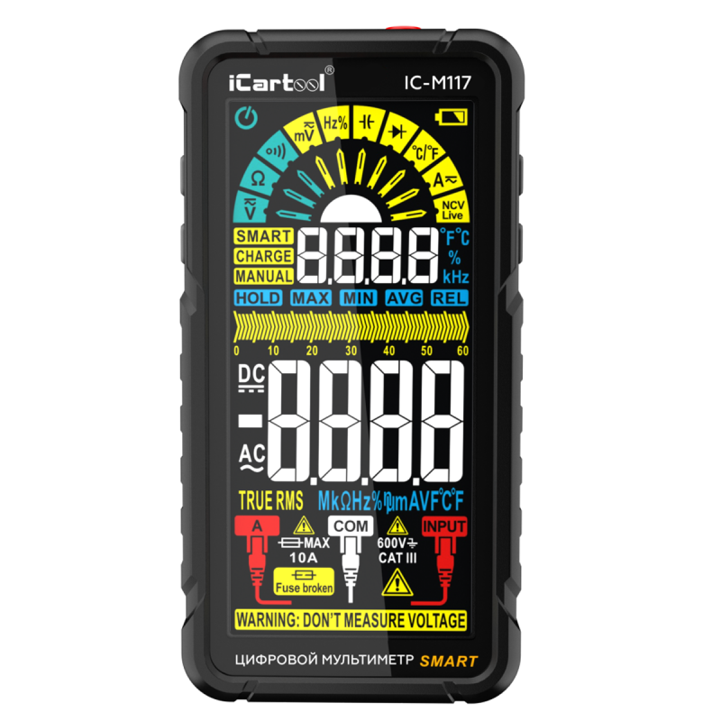 iCartool IC-M117 интеллектуальный цифровой мультиметр с автоматическим выбором режима измерения, большим многофункциональным цветным дисплеем, широким набором дополнительных функций и встроенным Li-ion аккумулятором. Имеет разрядность дисплея 6 000 отсчетов и рейтинг электробезопасности CAT III 600V. Работает в режиме TrueRMS.
