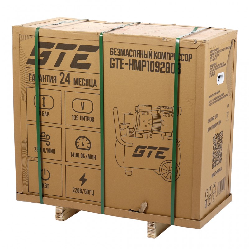 Компрессор пневматический 220В 3.0кВт 8атм. 280л/мин. ресивер-109л поршневой безмасляный GTE GTE-HMP109280B