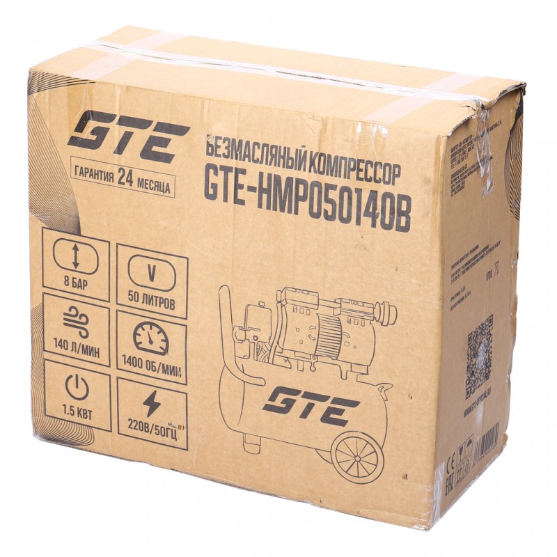 Компрессор пневматический 220В 1.5кВт 8атм.140л/мин. ресивер-50л поршневой безмасляный GTE GTE-HMP050140B